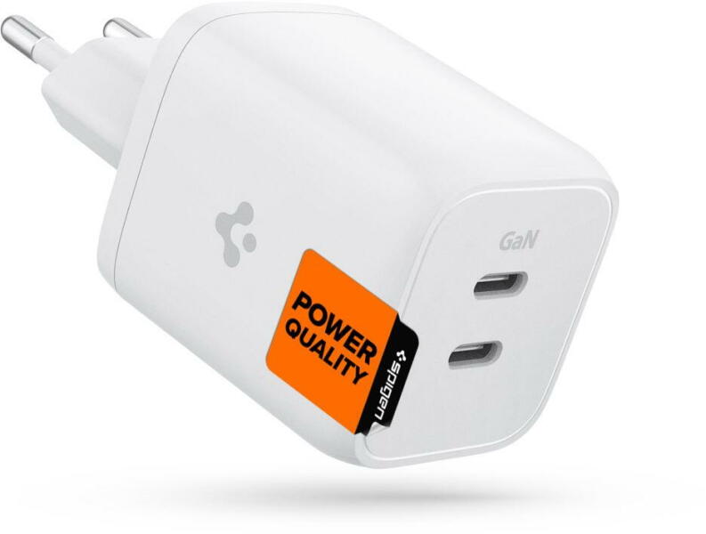 Spigen PowerArc 2x USB-C hálózati töltő adapter PD65W - fehér A kis méretű 65 W összteljesítményű töltő szupergyors és biztonságos energiamegújítást tesz lehetővé olyan eszközökben, mint a telefon, táblagép, hordozható konzol vagy laptop. Két PD szabványú USB-C aljzattal van felszerelve. A Galium Nitride használatával alkalmazott technológiának köszönhetően a tö