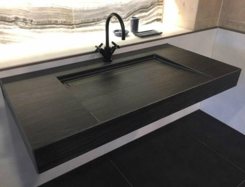 Burkolható mosdópult Burkolható MOSDÓPULT, rejtett rögzítés, lebegő design, integrált 70 x 650 mm vonalmenti folyókával, KOMBI (burkolható/szálcsiszolt rm acél) fedrács