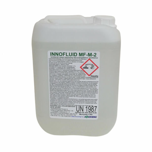 INNOFLUID MF-M/2 fertőtlenítő mosogatószer 5L - fertőtlenítő hatású készítmény kézi mosogatáshoz, tisztításhoz - antimikrobiális spektrum: baktericid, fungicid - előírt koncentráció: kézi mosogatás:1,5 %, hőmérséklet 40°C, behatási idő 5 perc - előírt koncentráció: felületfertőtlenítés: 1,5 %, hőmérséklet 20°C, behatási idő 10 perc Foglalkozásszerű felh
