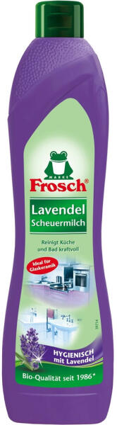 SÚROLÓKRÉM 500 ML FROSCH LEVENDULA A Frosch folyékony súrolószer hatékonyan távolítja el a zsíros szennyeződéseket, a vízkő- és szappan lerakódásokat minden kerámia, zománc, rozsdamentes acél és üvegkerámia felületről. Miért környezetbarát, öko termék: Természetes alapanyagú tisztító formula Növényi eredetű tenzideket tartalmaz Foszfát-, formaldehid- és oldó