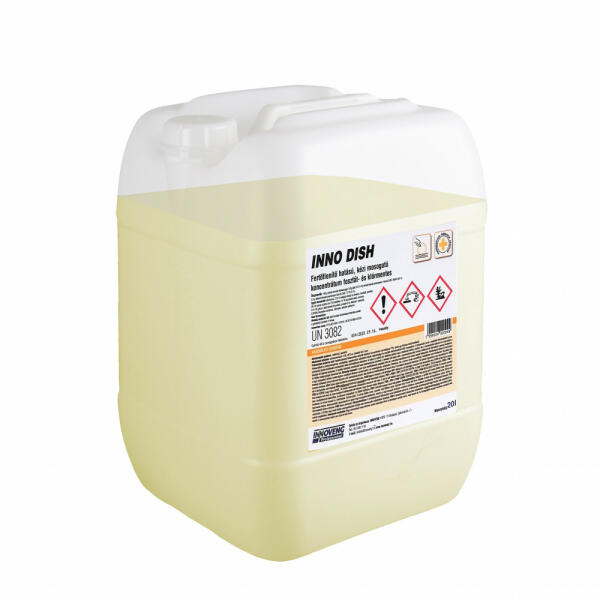 INNO-DISH fertőtlenítő hatású mosogatószer 20L - fertőtlenítő hatású mosogatószer - baktericid, yeasticid - szerkoncentráció 1,5%, 40°C-on, behatási idő: 5 perc Foglalkozásszerű felhasználásra készült folyékony koncentrátum (terméktípus PT4), amely egy fázisban tisztít-fertőtlenít. Felhasználható az élelmiszeriparban, vendéglátás, nagykonyhák, étkeztetési he