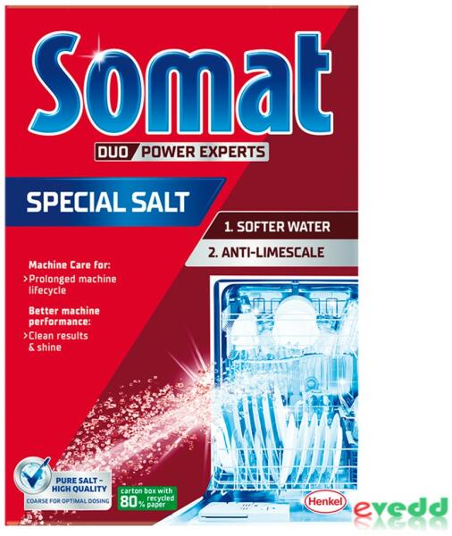 Termékleírás Termék információk Somat vízlágyító só vízkőlerakódás-gátló hatással, hosszabb élettartamot biztosít mosogatógépének és fontos részeinek, mint például a csöveknek vagy a fúvókának. Javítja a mosogatógép teljesítményét és véd a vízfoltok ellen is. Összetevők Nátrium-klorid Elkészítés és tárolás Elkészítés és felhasználás Töltse fe