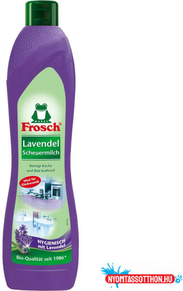 Súrolókrém 500 ml Frosch Levendula A Frosch folyékony súrolószer hatékonyan távolítja el a zsíros szennyeződéseket, a vízkő- és szappan lerakódásokat minden kerámia, zománc, rozsdamentes acél és üvegkerámia felületről. Miért környezetbarát, öko termék: Természetes alapanyagú tisztító formula Növényi eredetű tenzideket tartalmaz Foszfát-, formaldehid- és oldó