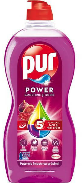 Hatékonyan távolítja el a zsírt, és egyben kíméli a kezét. Alkalmas allergiások számára. Az Európai Allergiakutató Központ ECARF ajánlása. Kézi mosogatószer. Pur Power Fig & Gránátalma étkészlethez 450ml