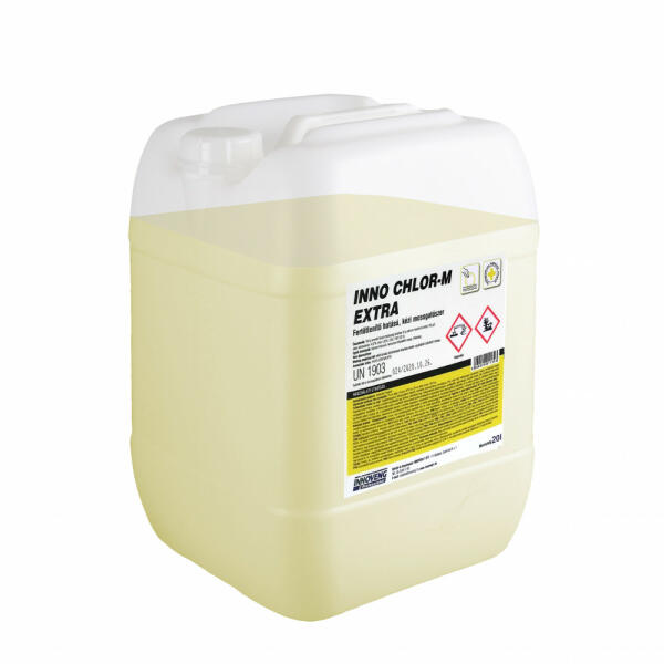 INNO CHLOR-M EXTRA fertőtlenítő hatású kézi mosogatószer 20L - fertőtlenítő hatású kézi mosogatószer - klór tartalmú - 70 °C felett ne használjuk - baktericid, fungicid - előírt alkalmazási koncentráció: 1%, 10 perc 40°C / 2%, 5 perc 40°C Felhasználható (élelmiszeripar, vendéglátás, egészségügy, szociális terület, tb. ) fertőtlenítő hatású kézimosogatásho