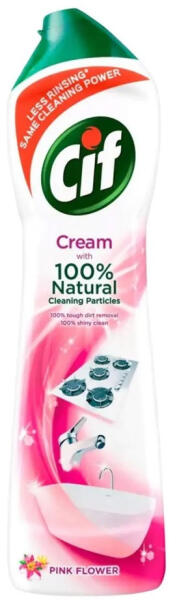Súrolókrém 500 ml Cif Pink GHS piktogram: Figyelmeztetés: Figyelem Figyelmeztető mondatok: H318 Súlyos szemkárosodást okoz. Cif Original súrolókrém mikrokristályokkal, eltávolítja a makacs szennyeződéseket is, mint az odaégett zsírfoltok és ételmaradékok, fürdőszobai vízkő lerakódások. Állagának köszönhetően könnyű leöblíteni. hatékony súrolókrém a makacs sz