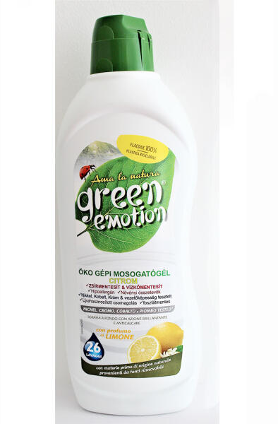 Green Emotion öko gépi mosogatógél citromos 650 ml GREEN EMOTION ÖKO GÉPI MOSOGATÓGÉL CITROMOS A citrom illatú mosogatógél zsírmentesíti, vízkőmentesíti és fényesíti az edényeket, 26 gépi mosásra elegendő. Kizárólag természetes, növényi összetevőket tartalmaz, újrahasznosítható energiaforrásokkal készül. Hipoallergén, nikkel, kobalt és króm vezetőképessége