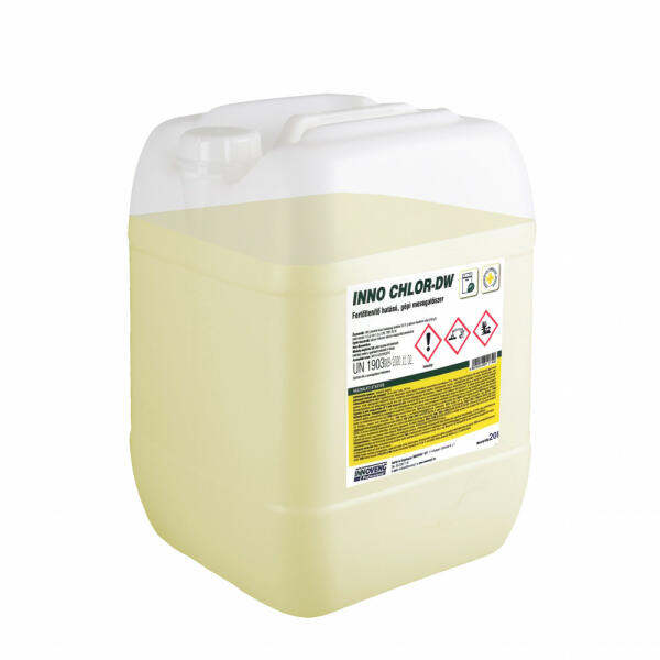 INNO CHLOR DW gépi mosogatószer 20L - fertőtlenítő hatású gépi mosogatószer - klór tartalmú - 70 °C felett ne használjuk - baktericid, fungicid - előírt alkalmazási koncentráció: 2%, 5 perc 50°C
