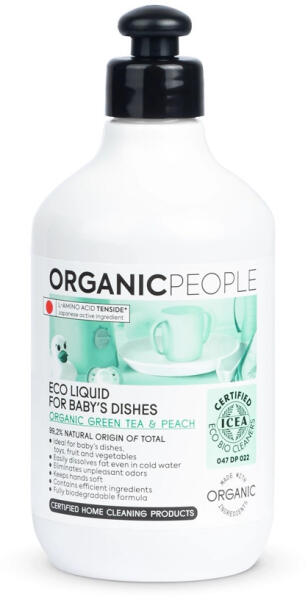 Öko mosogatószer babaedényekhez, bio zöldteával és barackkal, 500ml Babaedények, játékok, zöldségek, gyümölcsök mosogatására biztonságos a baba edények, játékok, gyümölcsök és zöldségek mosogatásához, 99,2%-ban természetes összetevők könnyen oldja a zsírt még hideg vízben is a barackkivonat megszünteti a kellemetlen szagokat bőrbarát Öko mosogatószer babaed