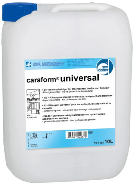 Egy sokoldalú tisztítószer, amely megkönnyíti az életed! Ezzel a koncentrált termékkel hatékonyan tisztíthatod a felületeket, eszközöket és edényeket. Zsíroldó hatásának köszönhetően könnyedén eltávolíthatod a makacs szennyeződéseket is. Dr. Weigert Caraform Universal – A sokoldalú tisztítószer, melyre mindig számíthatsz! A Caraform Universal egy erőteljes, még