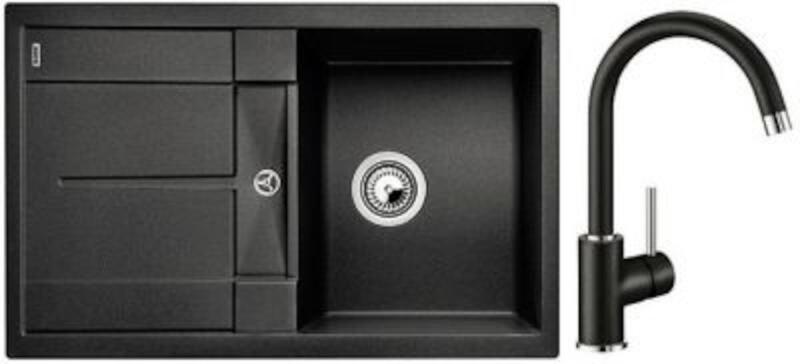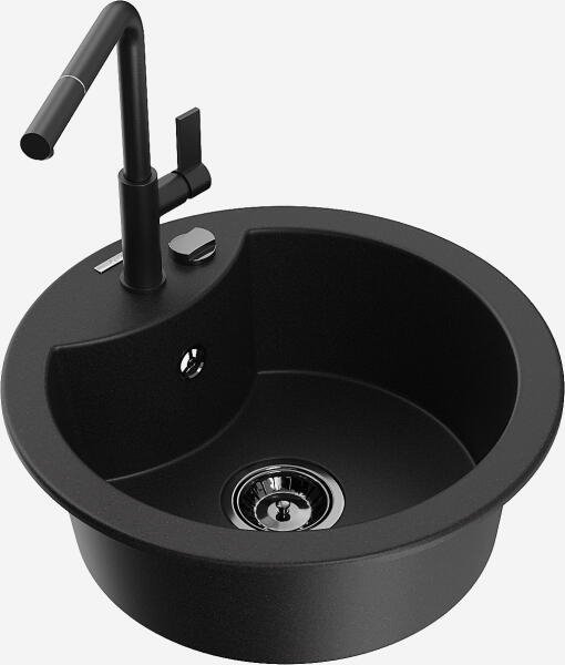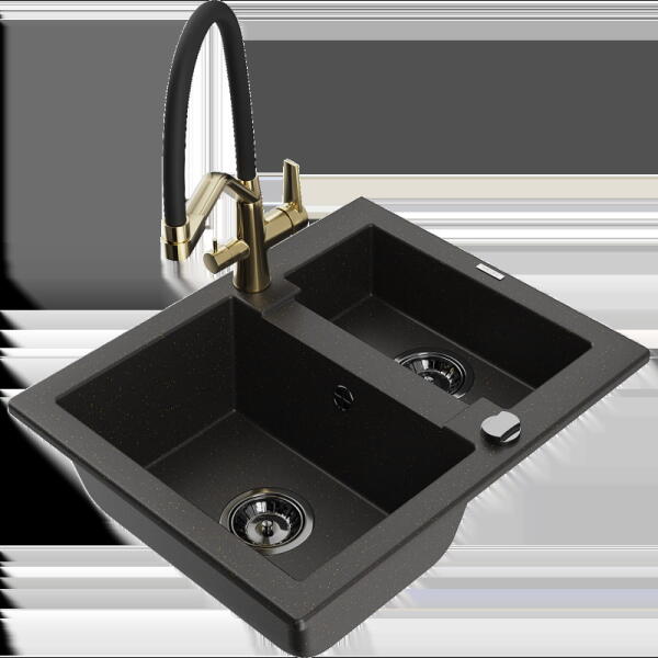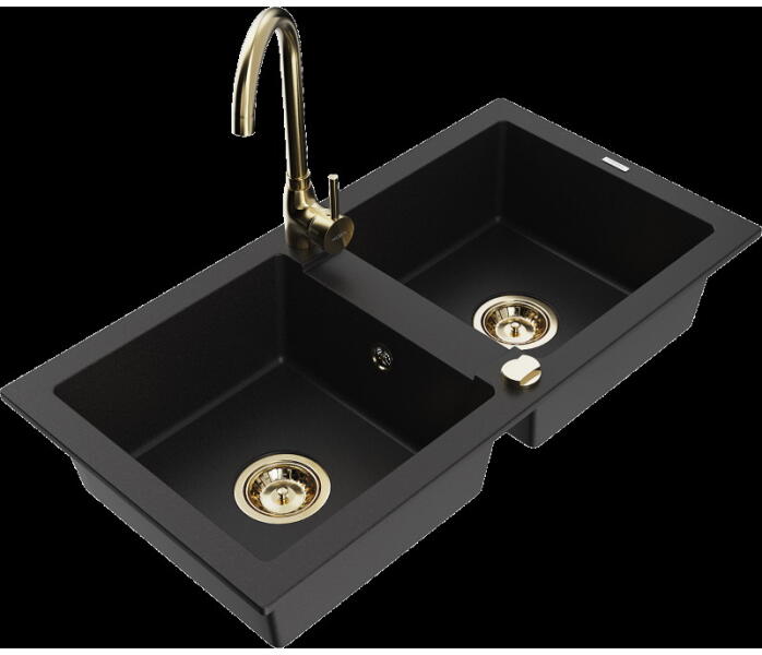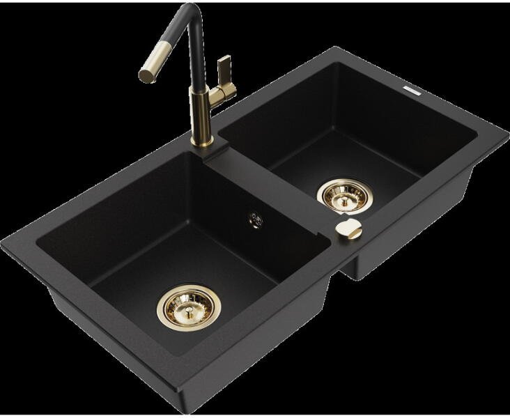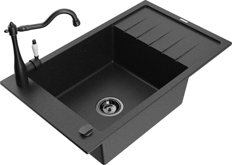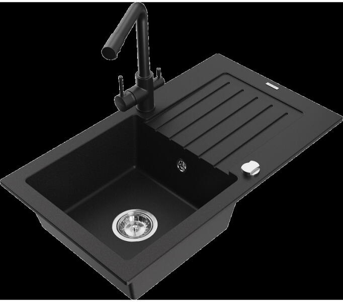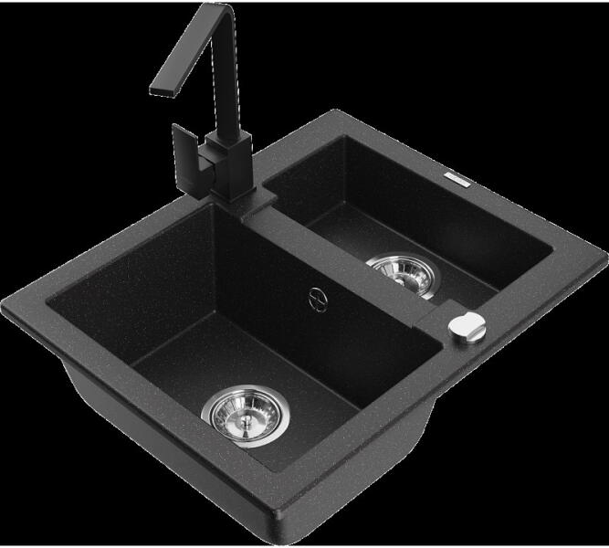 Mexen Elias, gránit mosogató 795x480x200 mm, 1 kamrás és Carla mosogató csaptelep, fekete-ezüst metál, 6511-73-670700-70-B Elias konyhai mosogató: Szín: fekete - ezüst metál Méretek: 795x480x200 mm Kamra mélysége: 190 mm Kamra méretei: 465x420 mm Lefolyó átmérője: ø90 mm Típus: 1 kamrás, rövid csepegtetővel Beépítés: felülről a munkalapba süllyesztve Anyaga: gránit (