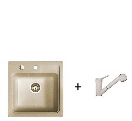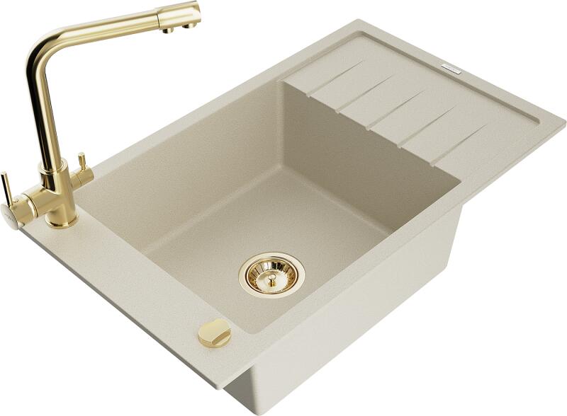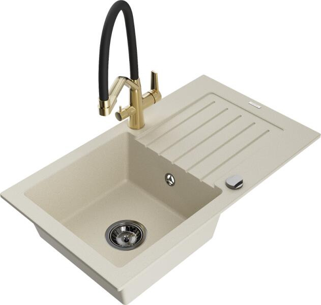 Mexen Elias, 1 kamrás gránit mosogató vízelvezetővel 795x480x200 mm és Duero arany csapteleppel, bézs, 6511-69-671600-50 Elias konyhai mosogató: Szín: bézs Mérete: 795x480x200 mm Kamra mélysége: 190 mm Kamra méretei: 465x420 mm Lefolyó átmérője: ø90 mm Típus: 1 kamrás, rövid csepegtetővel Típus: a pultba süllyesztve Anyaga: gránit (80% gránit adalékanyag 20% gyanta) Tú