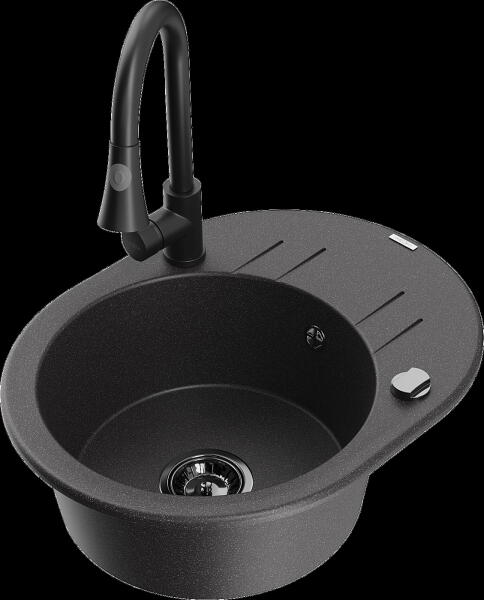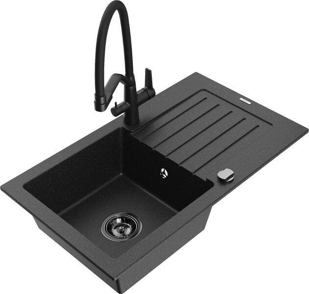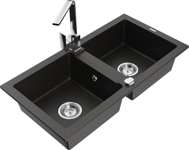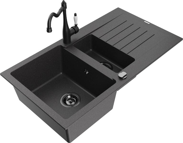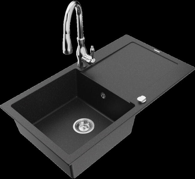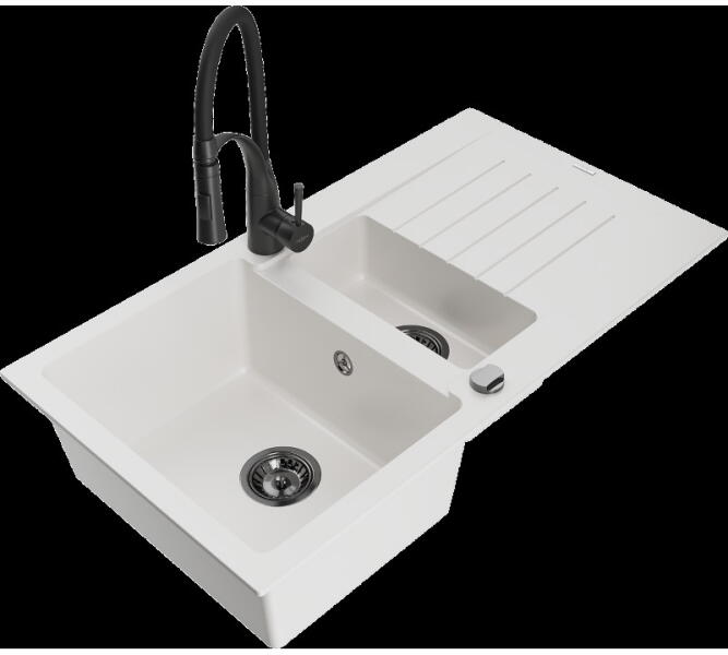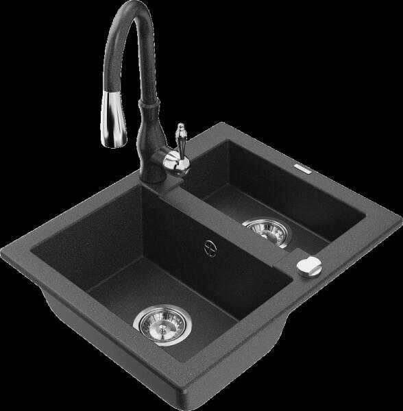 Mexen Matias, gránit mosogató 900x505x200 mm, 1,5 kamrás és mosogató csaptelep Carla, fekete foltos, 6502-76-670700-70-B Gyártó: Mexen Sorozat: Matias + Carlo Mosogató: Modell: 1,5-kamrás lefolyóval Beépítés: felülről a munkalapba való beágyazáshoz Felületkezelés: sima Hossza 900 mm Szélesség 505 mm Magasság: 200 mm Kamra mélysége: 180 mm (nagyobb), 115 mm (kisebb) Kamra m