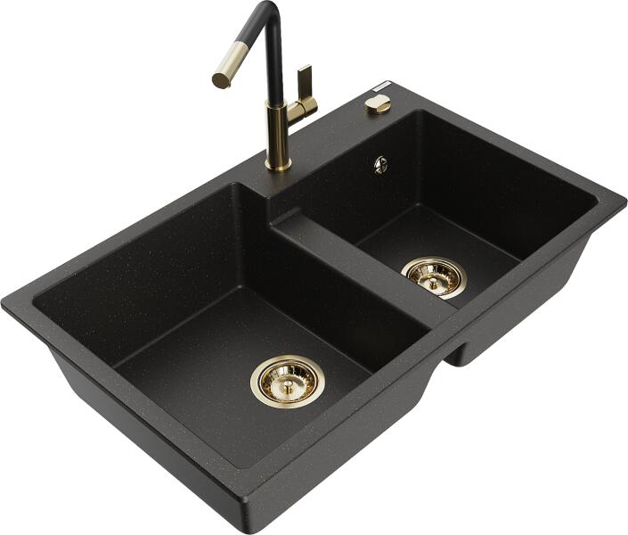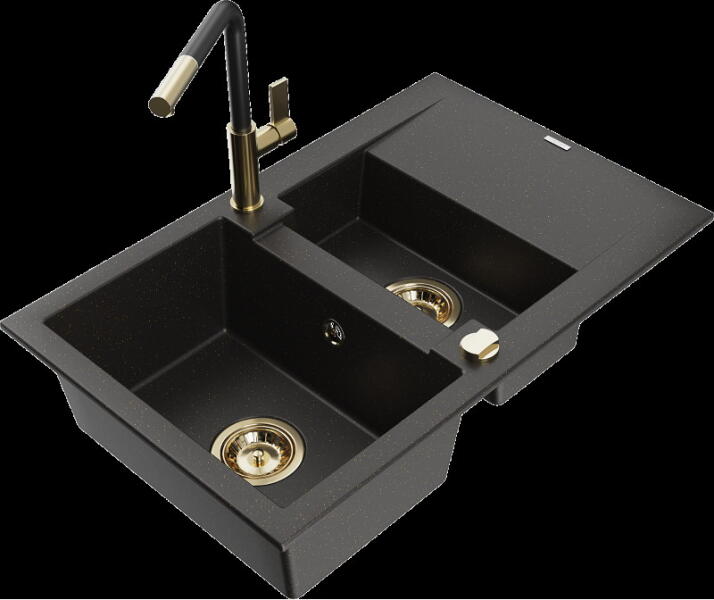 Mexen Mario, gránit mosogató 820x436x161 mm, 2 kamrás, fekete-arany metál króm szifonnal és króm mosogató keverővel Rita, 6504-75-670300-00 Gyártó: Mexen Sorozat: Mario Modell: 2 kamrás Szín: fekete - arany metál Felület: sima Felszerelés: munkalapra Hossza 820 mm Szélesség 436 mm Magasság: 161 mm Kamra mélysége: 151 mm Kamra mérete: 356x336 mm Lefolyó átmérője: 90 mm Szi