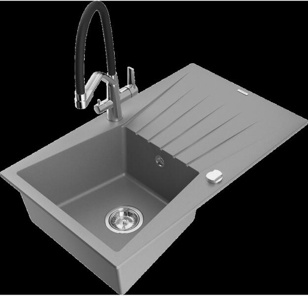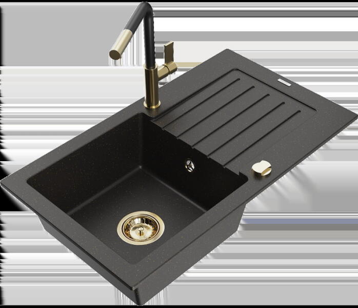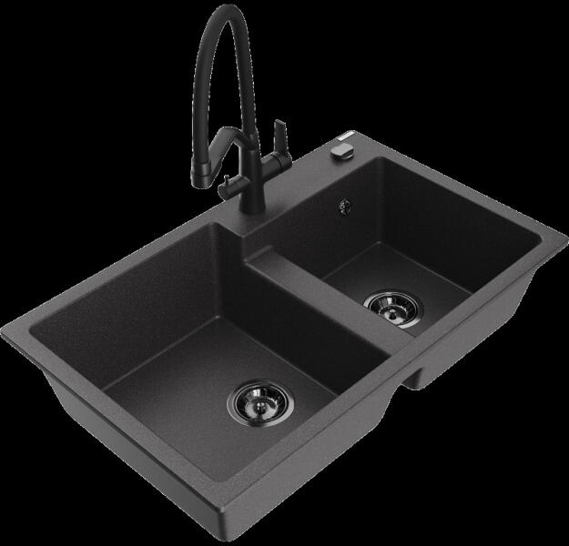 Mexen Pablo, gránit mosogató 752x436x161 mm, 1 kamrás és fekete Rita csaptelep, fekete-ezüst metál, 6510-73-670300-70 Gyártó: Mexen Sorozat: Pablo Mérete: 752x436x161 mm Kamra mélysége: 151 mm Kamra méretei: 356x332 mm Lefolyó átmérője: ø90 mm Szín: fekete - ezüst metál Típus: 1 kamrás csepegtetővel Típus: az asztallapba ágyazva Anyaga: gránit (80% gránit adalékanyag 2