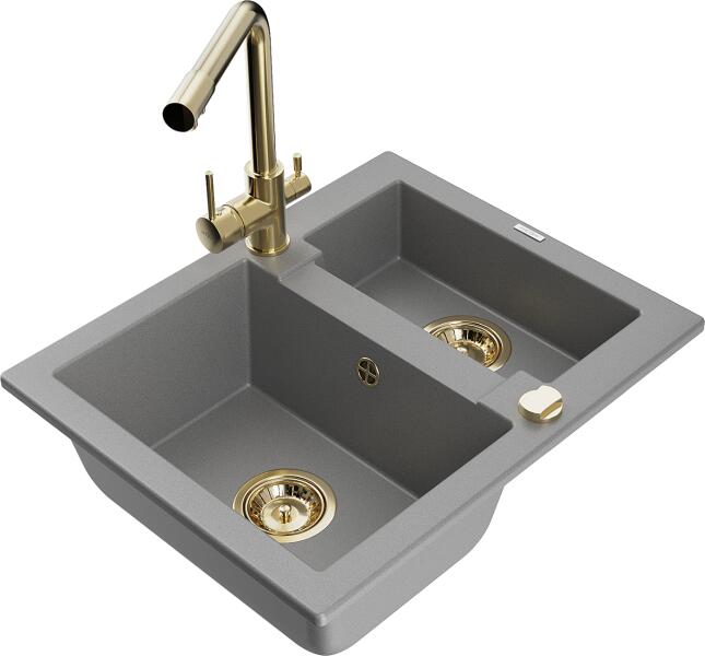 Mexen Carlos, 1,5 kamrás gránit mosogató 582x475x177 mm és Duero mosogató csaptelep, szürke, 6518-71-671600-50 Mexen Carlos konyhai mosogató: Gyártó: Mexen Sorozat: Carlos Modell: 1,5-kamrás Beépítés: felülről a munkalapba süllyesztve Méretek: 582x475x177 mm Kamra mélysége: 162 mm (nagyobb), 102 mm (kisebb) Kamra mérete: 395x272 mm (nagyobb), 375x182 mm (kisebb) Lefolyó átmé
