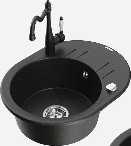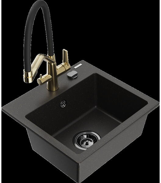 Mexen Kevin, gránit mosogató 586x458x190 mm, 1 kamrás és Carla mosogató csaptelep, fekete-arany metál, 6517-75-670700-70 Gyártó: Mexen Sorozat: Kevin Szín: fekete/arany metál Modell: 1 kamrás, rövid leeresztővel Felszerelés: munkalapra Hossza 586 mm Szélesség 458 mm Magasság: 190 mm Kamra mérete: 378x374 mm Kamra mélysége: 175 mm A lefolyó átmérője: Ø 90 mm Szifon + automa