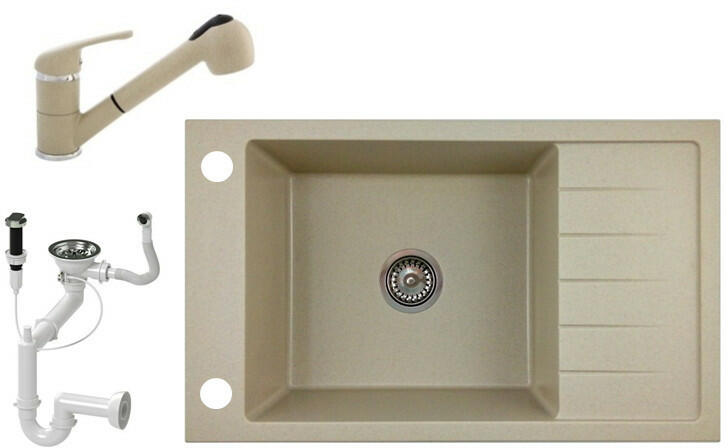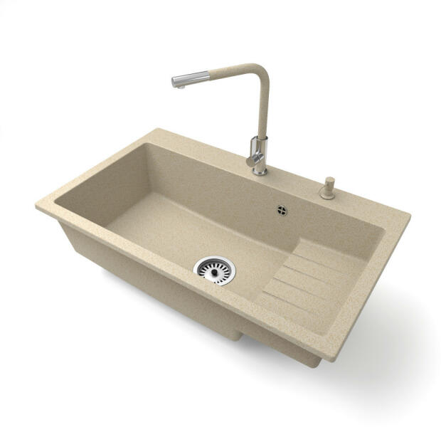 EOS Evinion gránit mosogató homokbézs színben. Megfordítható, így a mosogató medence kerülhet a bal- és a jobb oldalra is. A mosogatón 2 lyuk található egy a csaptelepnek és egy a beépíthető mosogatószer adagolónak vagy automata dugókiemelőnek. Összetétele 80% gránit őrlemény és 20% akril, ami megfelel a szabvány gránit mosogató összetételnek. Beépíthető 60 cm sz