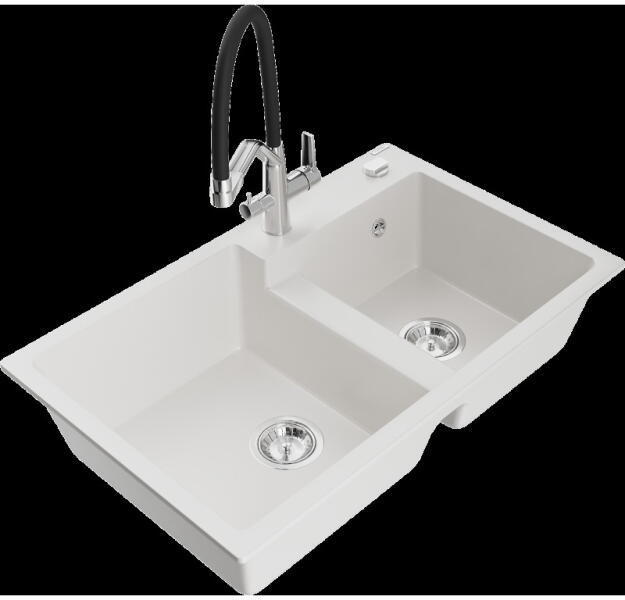 Mexen Mario konyhai mosogató: Méretek: 820x436x161 mm Kamra mélysége: 151 mm Kamra méretei: 356x336 mm Lefolyó átmérője: ø90 mm Típus: 2 kamrás Típus: felülről az asztal munkalapjába süllyesztve Anyaga: gránit (80% gránit adalékanyag 20% gyanta) Túlfolyó lyuk: igen Lyukak: 2 (1 x mosogató csaptelep, 1 x automatikus leeresztő csavar vezérlés) Nagy ellenállás a karc