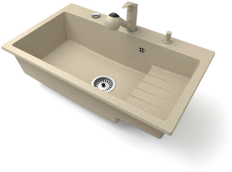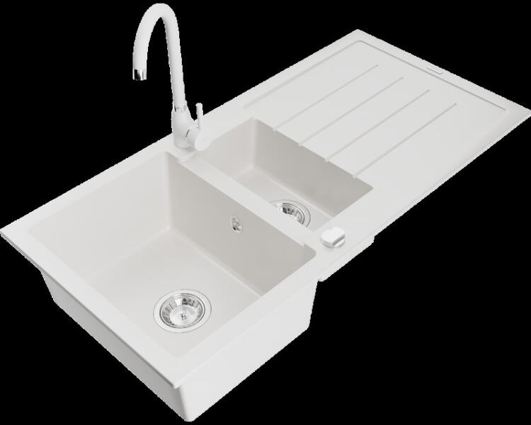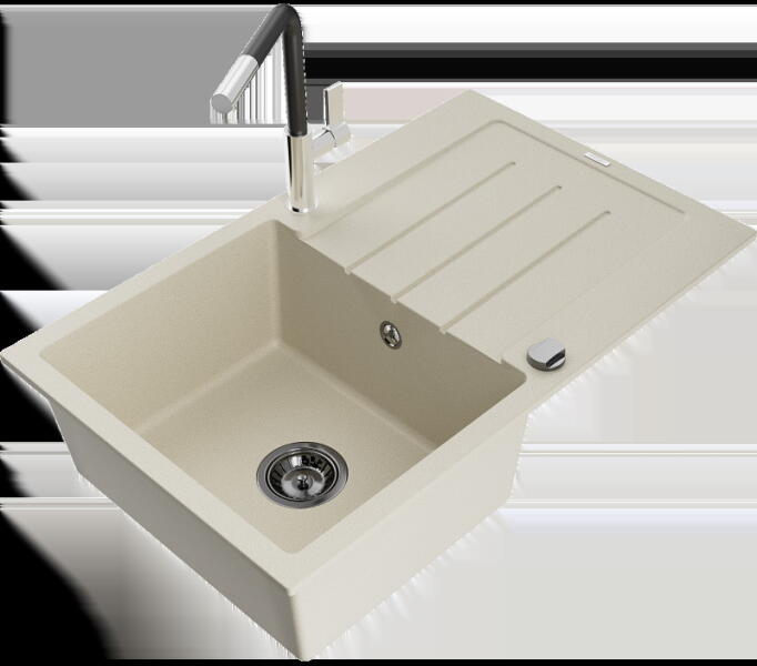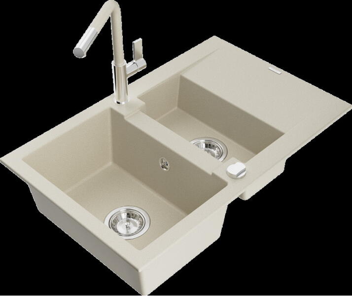 Mexen Matias, gránit mosogató 900x505x200 mm, 1,5 kamrás és fekete csaptelep Rita, bézs, 6502-69-670300-70 Gyártó: Mexen Sorozat: Matias Modell: 1,5-kamrás lefolyóval Beépítés: a munkalapba való beágyazáshoz Szín: bézs Felületkezelés: sima Hossza 900 mm Szélesség 505 mm Magasság: 200 mm Kamra mélysége: 180 mm (nagyobb), 115 mm (kisebb) Kamra mérete: 435x335 mm (nagyobb),