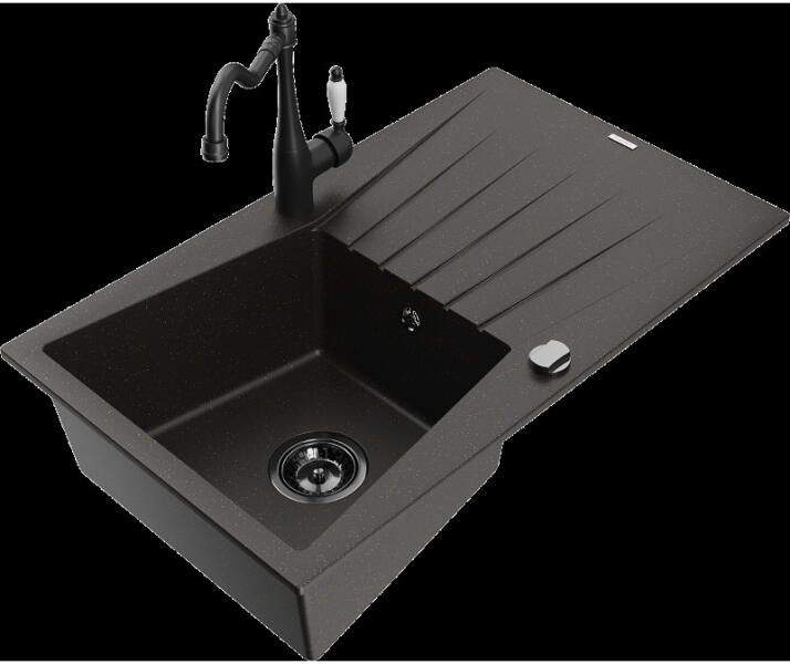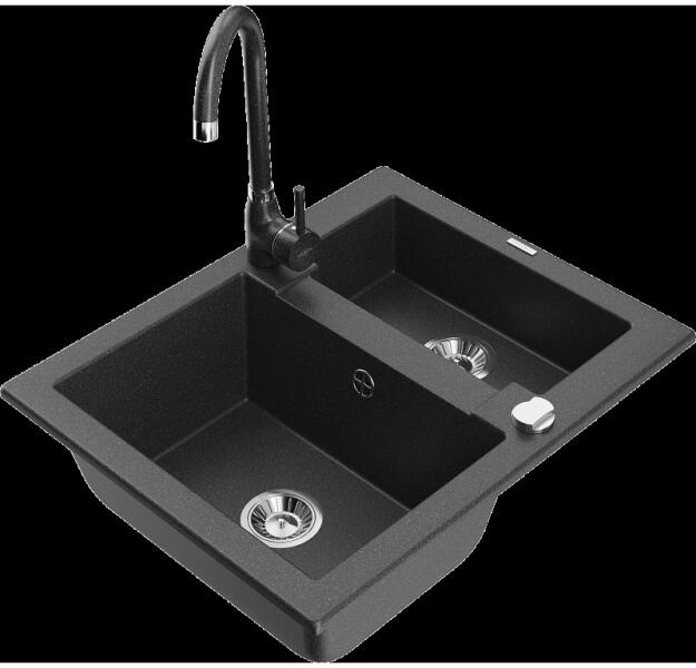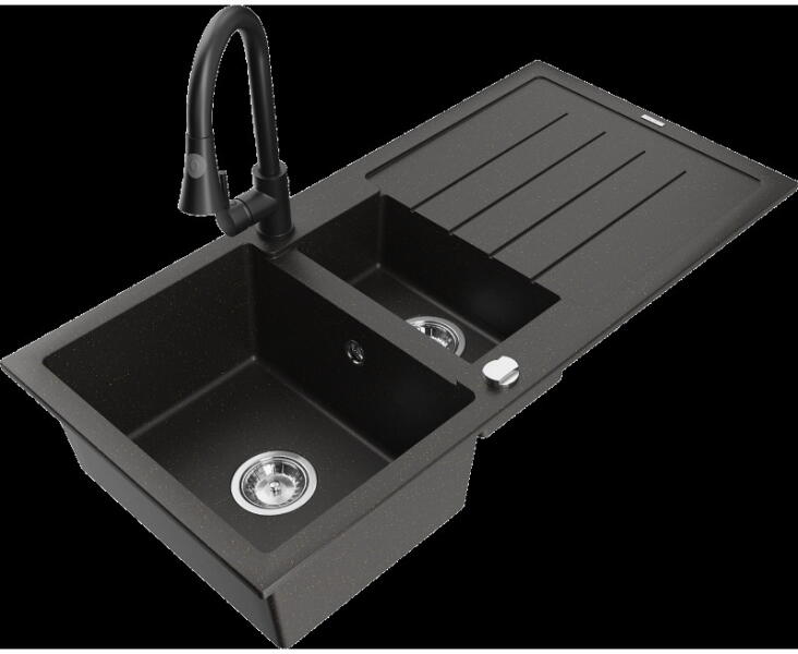 Mexen Tomas, gránit mosogató 800x500x190 mm, 2 kamrás és fekete Telma csaptelep, fekete foltos, 6516-76-670200-70-B A konyhai mosogató műszaki adatai: Gyártó: Mexen Sorozat: Tomas Modell: 2-kamrás csepptálca nélkül Felszerelés: munkalapra Szín: fekete foltos Felület: sima Hossza 800 mm Szélesség 500 mm Magasság: 190 mm Kamra mélysége: 180 mm (nagyobb), 180 mm (kisebb) Kamra m