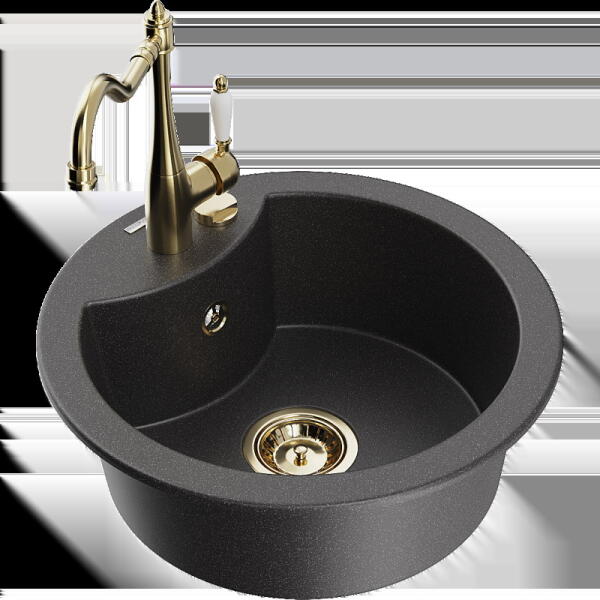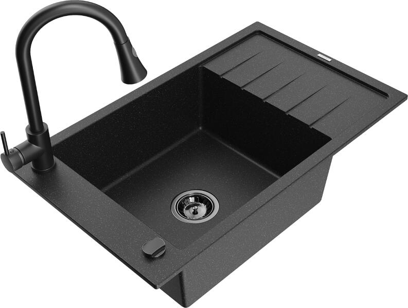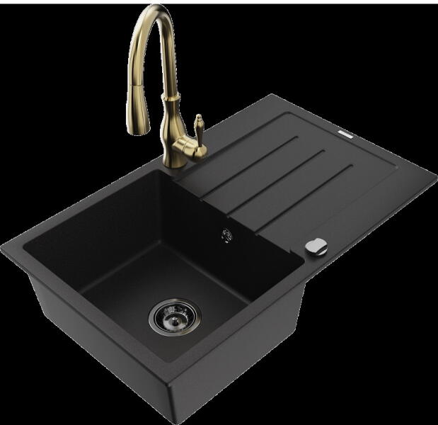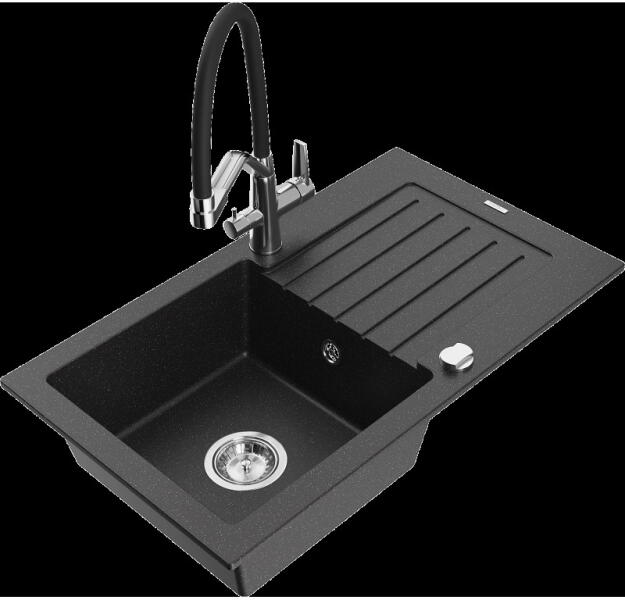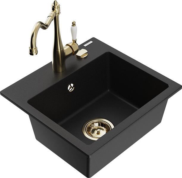 Mexen Milo, gránit mosogató 435x410x171 mm, 1 kamrás és Carla mosogató csaptelep, fekete, 6505-77-670700-50 Milo konyhai mosogató: Gyártó: Mexen Fekete szín Méretek: 435x410x171 mm Kamra mélysége: 161 mm Kamra méretei: 375x280 mm Lefolyó átmérője: ø90 mm Típus: 1 kamrás Beépítés: felülről a pultba süllyesztve Anyaga: gránit (80% gránit adalékanyag 20% gyanta) Túlfoly