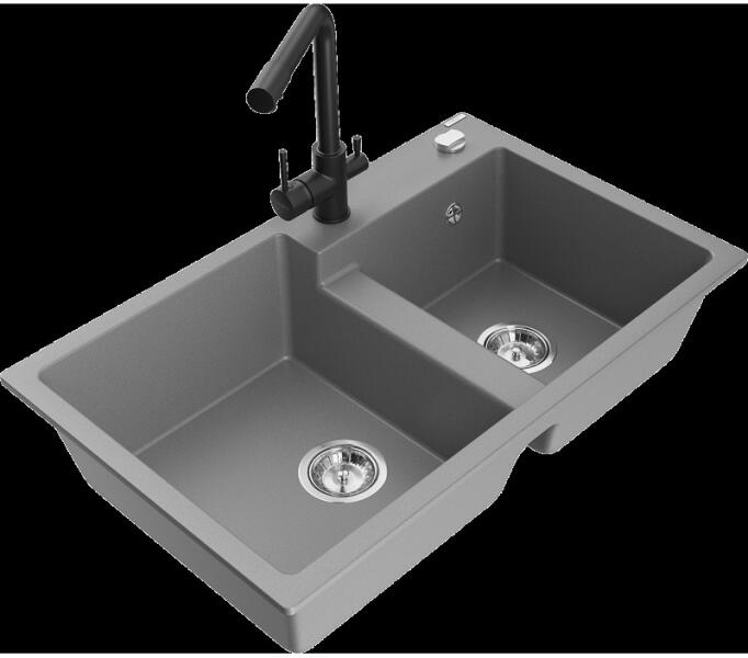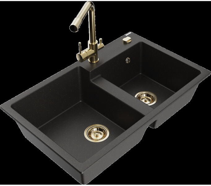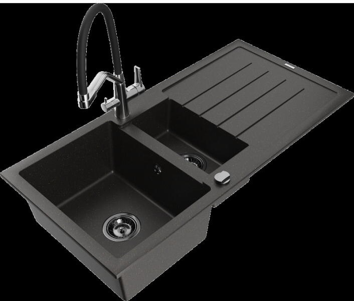 Mexen Mario, gránit mosogató 820x436x161 mm, 2 kamrás és Aster mosogató csaptelep, fekete-ezüst metál, 6504-73-73450-70-B Gyártó: Mexen Sorozat: Mario + Aster Mosogató: Méretek: 820x436x161 mm Kamra mélysége: 151 mm Kamra méretei: 356x336 mm Lefolyó átmérője: ø90 mm Szín: fekete/ezüst metál Típus: 2 kamrás Típus: felülről az asztal munkalapjába süllyesztve Anyaga: grá