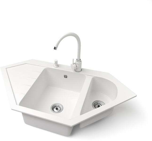 NERO Joker sarok mosogató, ami egyben praktikus és impozáns látványelem is a konyhában. Tökéletes választás azokba a konyhákba, ahol a mosogató rész a sarokban lett kialakítva. Szögletes, határozott vonalvezetése nagyszerűen illik modern vagy minimál stílusú konyhákba. A mosogatón 2 lyuk lett kialakítva, egy a csaptelepnek és egy a beépíthető mosogatószer adagolónak v