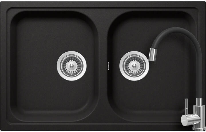 Schock Viola N-200S konyhai mosogatótálca Cristalite Nero 790 x 500 mm, gránit, megfordítható, hagyományos beépítés, fekete munkalapba beépíthető, kétmedencés, csepegtető nélküli, ideálisan illeszkedik a minimum 80 cm-es alsószekrényhez. A csaptelep helye előre elkészített, könnyedén áttörhető. A csomagban találja a használati útmutatót, amely részletes leírást a