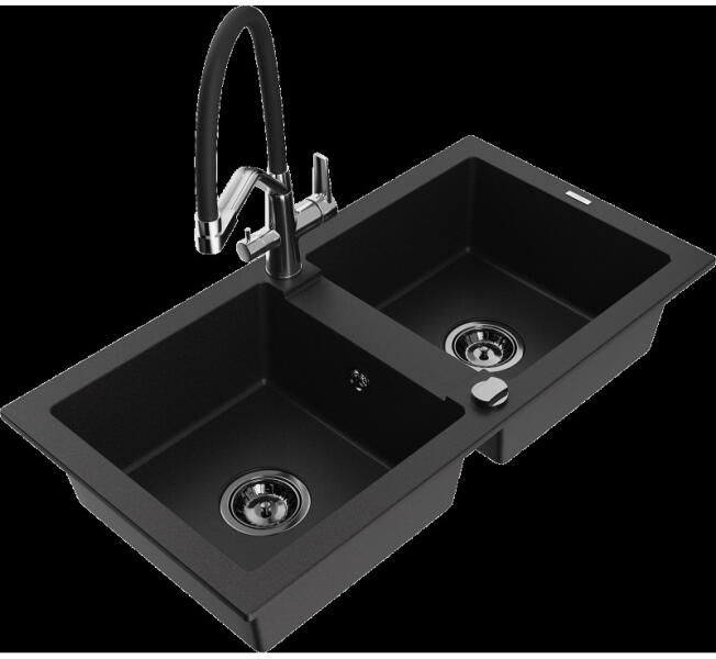 Mexen Tomas konyhai mosogató: Gyártó: Mexen Sorozat: Tomas Modell: 2 kamrás Beépítés: felülről a munkalapba süllyesztve Méretek: 800x500x190 mm Kamra mélysége: 180 mm (nagyobb), 180 mm (kisebb) Kamra mérete: 440x387 mm (nagyobb), 370x303 mm (kisebb) Lefolyó átmérője: 90 mm Szifon + automatikus leeresztő csavar Anyaga: gránit (80% gránit - kő, 20% gyanta) Sima felület a könn