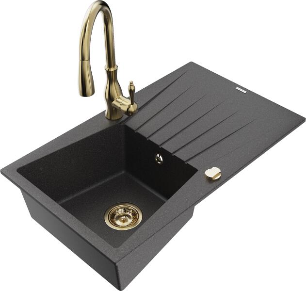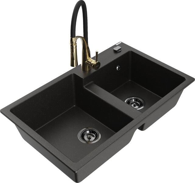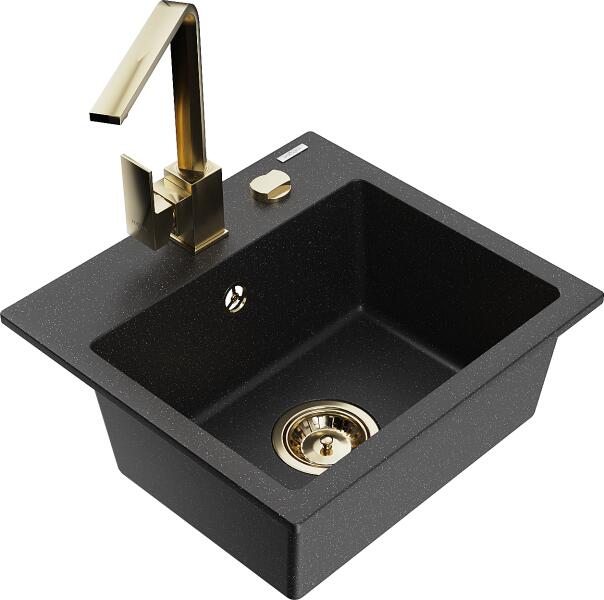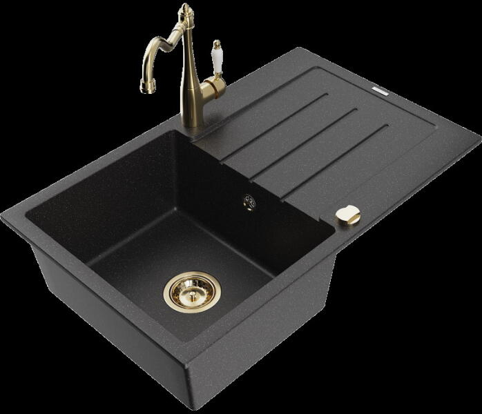 Mexen Milo, 1 kamrás gránit mosogató 435x410x171 mm és Rita arany csaptelep, fekete-ezüst metál, 6505-73-670300-50 Mosogató: Gyártó: Mexen Sorozat: Milo Szín: fekete - ezüst metál Mérete: 435x410x171 mm Kamra mélysége: 161 mm Kamra méretei: 375x280 mm Lefolyó átmérője: ø90 mm Típus: 1 kamrás Típus: A pult tetejébe süllyesztett Anyaga: gránit (80% gránit adalékanyag 20%