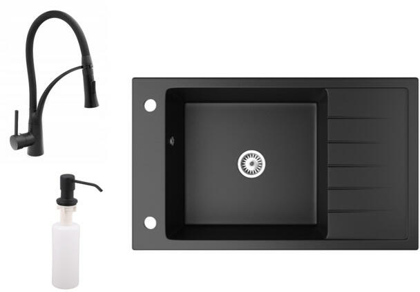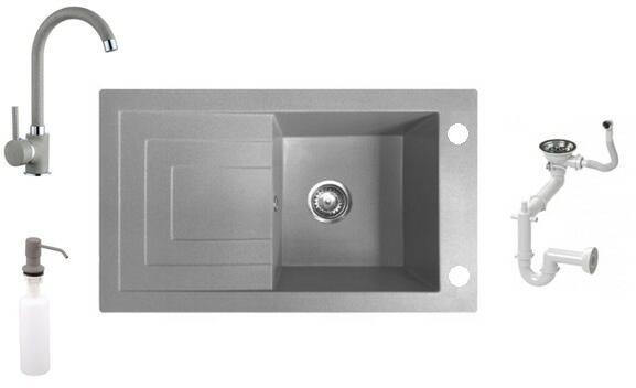 Nero Cortina gránit mosogató szürke színben. A teljes készlet tartalmazza a mosogatót, a csaptelepet, a szifonkészletet és a mosogatószer adagolót. A csaptelep és az adagoló a medence külső peremén helyezkedik el, így biztosítva több helyet és jobb hozzáférést a csepegtető részhez, mindemellett modernebb megjelenést is eredményez. Letisztult, szögletes formavilág jellem