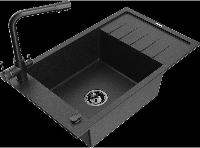 Mexen Gaspar, 1,5 kamrás gránit mosogató csepptálcával 74x48 cm Telma konyhai csapteleppel, fekete-ezüst, 6507-73-670200-70 Mosogató: Termékkód: 6507731505-73 Mérete: 737x475x177 mm Kamra mélysége: 167 mm (nagyobb), 107 mm (kisebb) Kamra méretei: 395x272 mm (nagyobb), (kisebb) 375x182 mm Lefolyó átmérője: ø90 mm Típus: 1,5-kamrás, rövid csepegtetőtálcával Típus: Az asztall