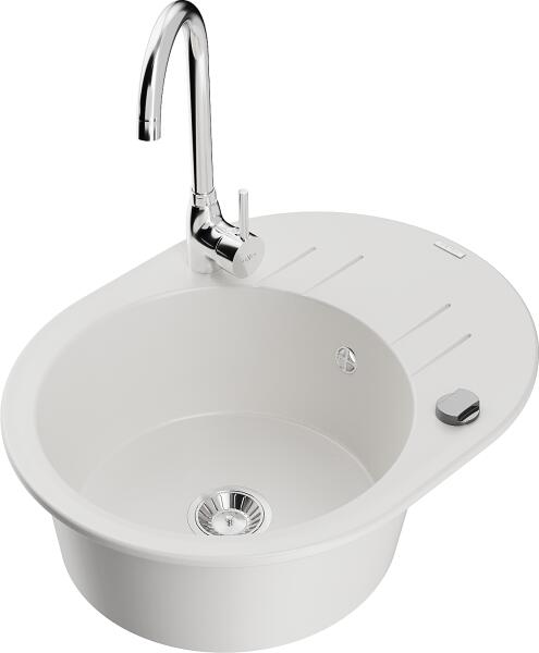 Mexen Kevin, gránit mosogató 586x458x190 mm, 1 kamrás és króm csaptelep Telma, fehér, 6517-20-670200-00 Gyártó: Mexen Sorozat: Kevin Modell: 1 kamrás, rövid leeresztővel Felszerelés: munkalapra Hossza 586 mm Szélesség 458 mm Magasság: 190 mm Kamra mérete: 378x374 mm Kamra mélysége: 175 mm A lefolyó átmérője: Ø 90 mm Szifon + automatikus leeresztő csavar Anyaga: gránit (80%