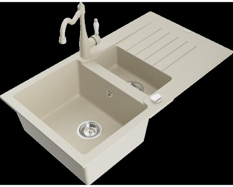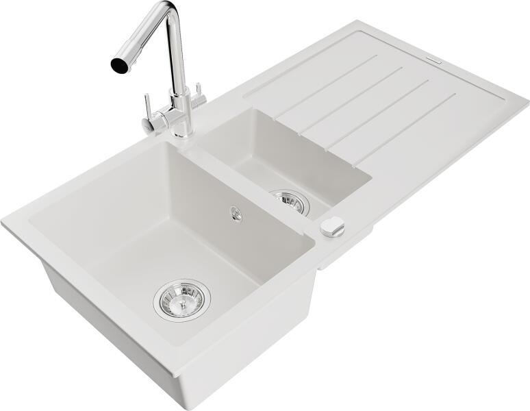 Mexen Andres, gránit mosogató 1000x500x200 mm, 1,5 kamrás + Duero króm csaptelep, fehér, 6515-20-671600-00 Gyártó: Mexen Sorozat: Andres Modell: 1,5-kamrás lefolyóval Felszerelés: munkalapra Fehér szín Felületkezelés : sima Hossza 1000 mm Szélesség 500 mm Magasság: 200 mm Kamra mélysége: 190 mm (nagyobb), 115 mm (kisebb) Kamra mérete: 430x330 mm (nagyobb), 340x170 mm (kisebb) L