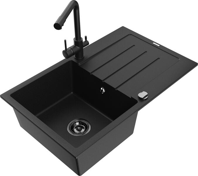 Mexen Bruno, 1 kamrás gránit mosogató lefolyóval 795x495x200 mm Duero fekete csapteleppel, fekete, 6513-77-671600-70-B Mosogató: Mérete: 795x495x200 mm Kamra mélysége: 190 mm Kamra méretei: 440x360 mm Lefolyó átmérője: ø90 mm Típus: 1 kamrás csepegtetővel Típus: a munkalapba süllyesztve Fekete szín Anyaga: gránit (80% gránit adalékanyag 20% gyanta) Túlfolyó lyuk: igen Nyí