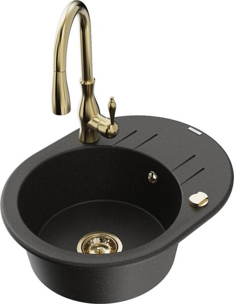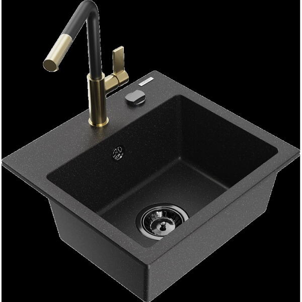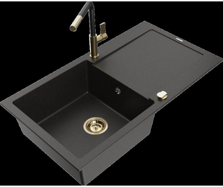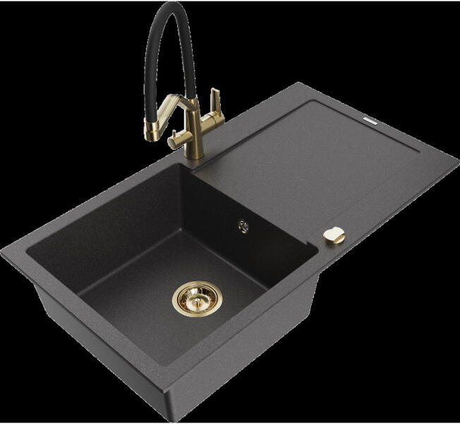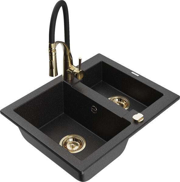 Mexen Kevin, gránit mosogató 586x458x190 mm, 1 kamrás és Savita mosogató csaptelep, fekete-arany metál, 6517-75-672601-50 Gyártó: Mexen Sorozat: Kevin Szín: fekete - arany metál Modell: 1 kamrás, rövid leeresztővel Beépítés: a munkalapba való beágyazáshoz Méretek: 586 x 458 x 190 mm Kamra mérete: 378 x 374 mm Kamra mélysége: 175 mm A lefolyó átmérője: Ø 90 mm Szifon + a
