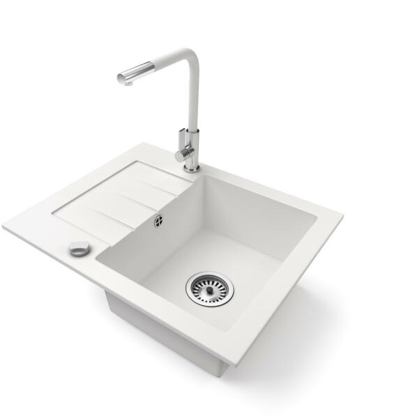 NERO Monza gránit mosogatótálca fehér színben. Kis méretének köszönhetően tökéletesen illik olyan kisebb méretű konyhákba ahol minden centiméter helyre szükség van. Mindössze 57 cm széles, amelyet mélységével kompenzál, így mind a medence, mind a csepegtető rész tökéletesen használható. Modern, karakteresen szögletes formavilág és kiemelkedő anyagvastagság jelle