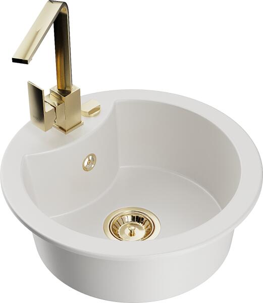 Mexen Diego, 1 kamrás gránit mosogató 488x488x167 mm, arany szifon, arany csaptelep Rita, fehér, 6512-20-670300-50 Gyártó: Mexen Sorozat: Diego Modell: 1 kamrás Felszerelés: munkalapra Fehér szín Felület típusa : sima Hossza 488 mm Szélesség 488 mm Magasság: 167 mm Kamra mélysége: 157 mm Kamra mérete: 406 mm Lefolyó átmérője: 90 mm Szifon + automatikus leeresztő Anyaga: gr