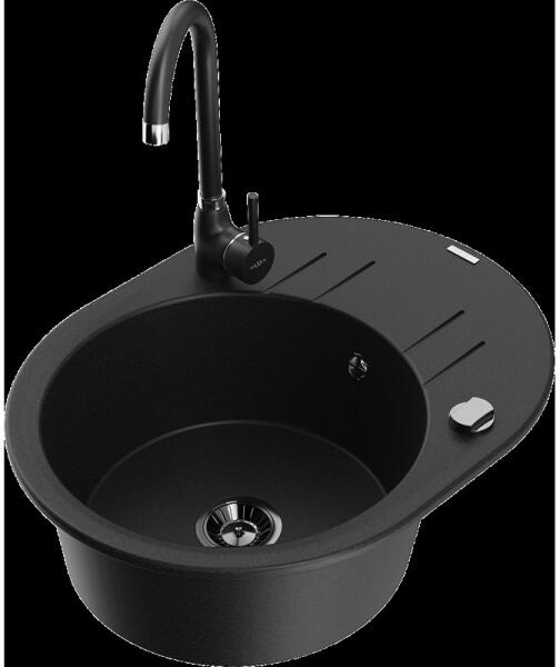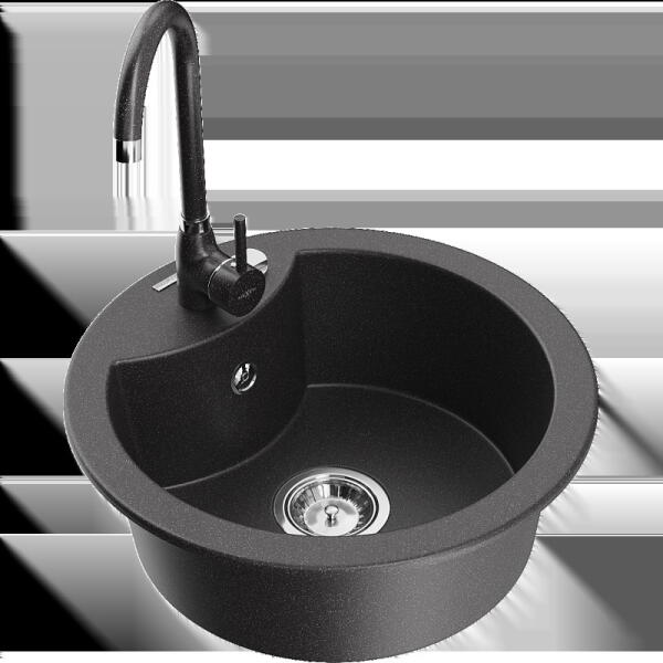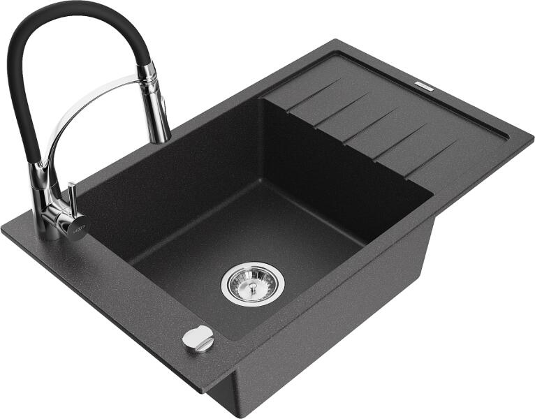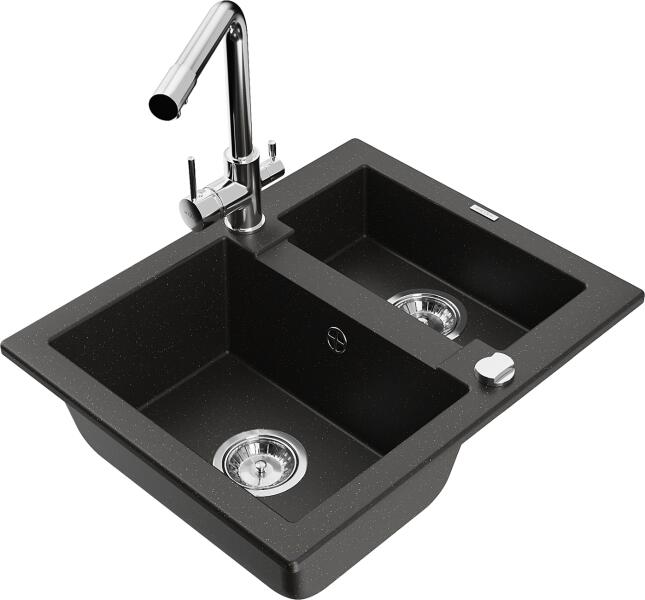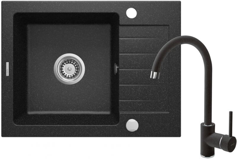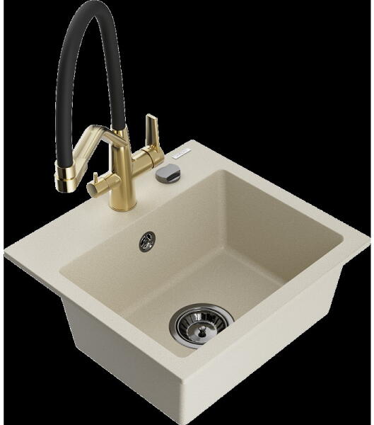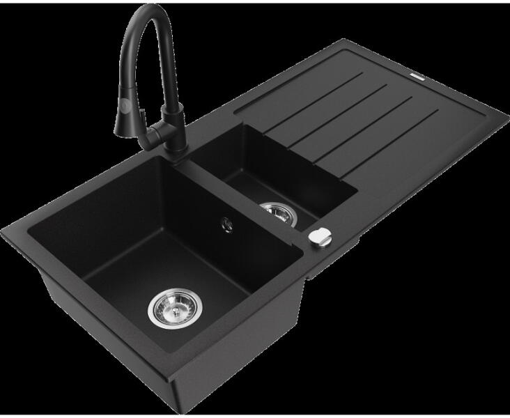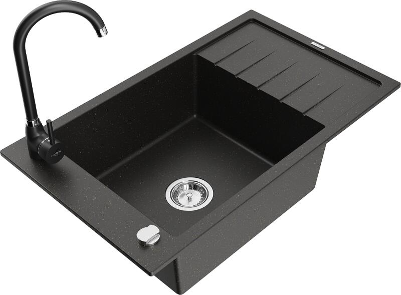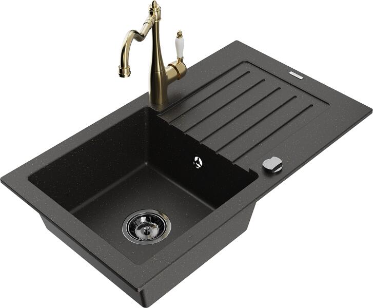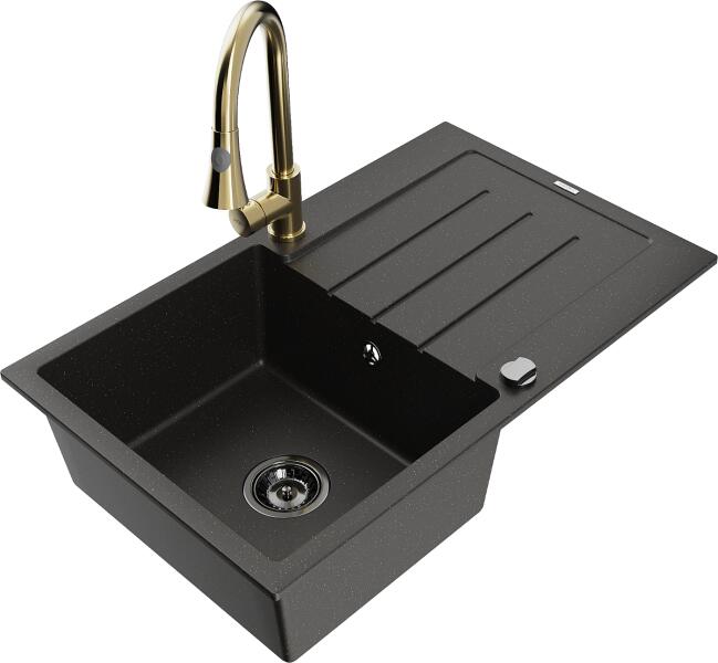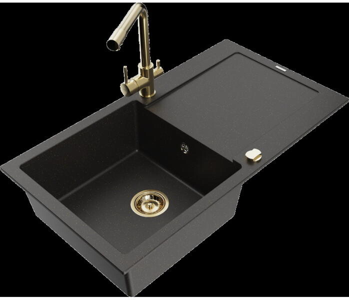 Mexen Pablo, gránit mosogató 752x436x161 mm, 1 kamrás és Carla mosogató csaptelep, fekete-arany metál, 6510-75-670700-50-B Gyártó: Mexen Sorozat: Pablo Méretek: 752x436x161 mm Kamra mélysége: 151 mm Kamra méretei: 356x332 mm Lefolyó átmérője: ø90 mm Szín: fekete - arany metál Típus: 1 kamrás csepegtetővel Típus: felülről a pultba süllyesztve Anyaga: gránit (80% gránit a