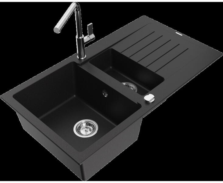 Mexen Elias konyhai mosogató: Gyártó: Mexen Sorozat: Elias Modell: 1 kamrás Beépítés: felülről a munkalapba süllyesztve Méretek: 795x480x200 mm Kamra mélysége: 190 mm Kamra mérete: 465x420 mm Lefolyó átmérője: 90 mm Szifon + automatikus leeresztő csavar Anyaga: gránit (80% gránit - kő, 20% gyanta) Sima felület a könnyű tisztítás érdekében: igen Megnövelt ellenállás