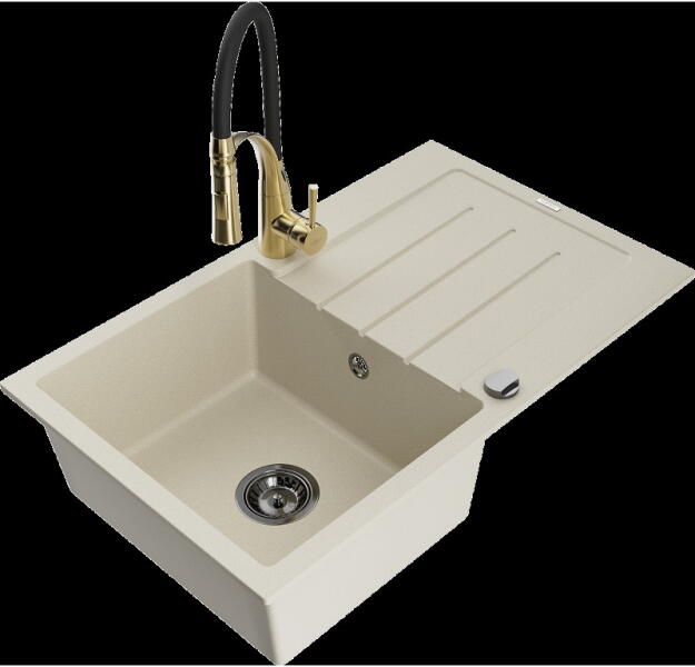 Mexen Elias, 1 kamrás gránit mosogató csepptálcával 80x48 cm Telma konyhai csapteleppel, fekete-arany, 6511-75-670200-70 Mosogató: Termékkód: 6511791005-75 Mérete: 795x480x200 mm Kamra mélysége: 190 mm Kamra méretei: 465x420 mm Lefolyó átmérője: ø90 mm Típus: 1-kamrás, rövid csepptálcával Típus: Az asztallapba süllyesztett Szín: fekete-arany Anyaga: gránit (80% gránit ad