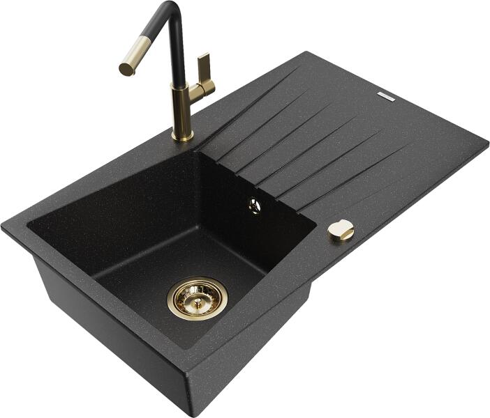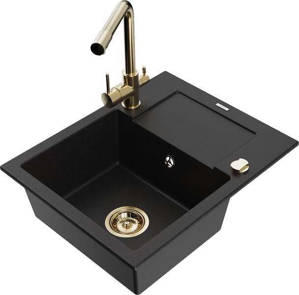 Mexen Enzo, gránit mosogató 576x465x174 mm, 1 kamrás, arany fényes csaptelep Duero, fekete, 6506-77-671600-50 Gyártó: Mexen Sorozat: Enzo Modell: 1 kamrás, rövid csepegtetővel Hossza 576 mm Szélesség 465 mm Magasság: 174 mm Kamra mélysége: 164 mm Kamra mérete: 395x320 mm Szifon + automatikus leeresztő Anyaga: gránit (80% gránit - kő, 20% gyanta) Megnövelt ütésállóság, karc