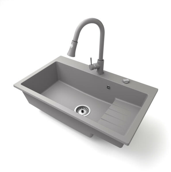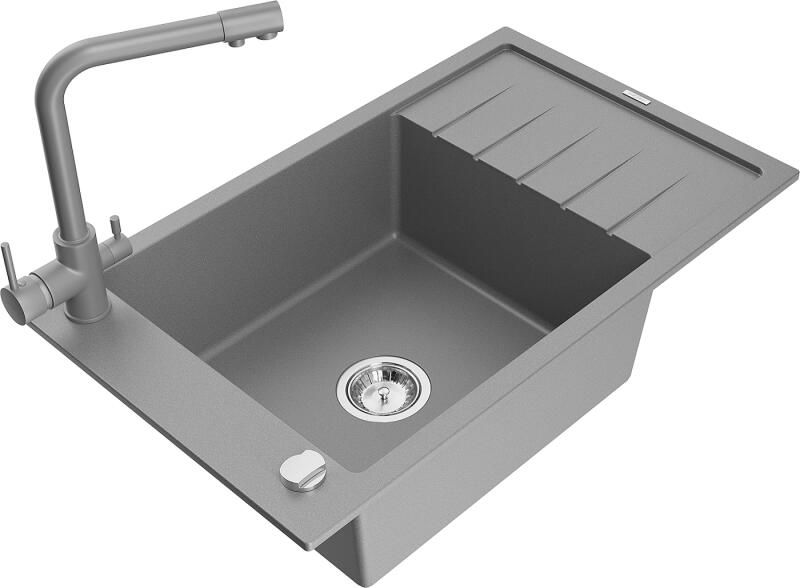 Mexen Elias, 1 kamrás gránit mosogató lefolyóval 795x480x200 mm és Duero szürke csaptelep, szürke, 6511-71-671600-71 Elias konyhai mosogató: Szín: szürke Mérete: 795x480x200 mm Kamra mélysége: 190 mm Kamra méretei: 465x420 mm Lefolyó átmérője: ø90 mm Típus: 1 kamrás, rövid csepegtetővel Típus: a pultba süllyesztve Anyaga: gránit (80% gránit adalékanyag 20% gyanta) Túlf