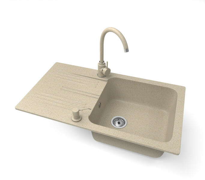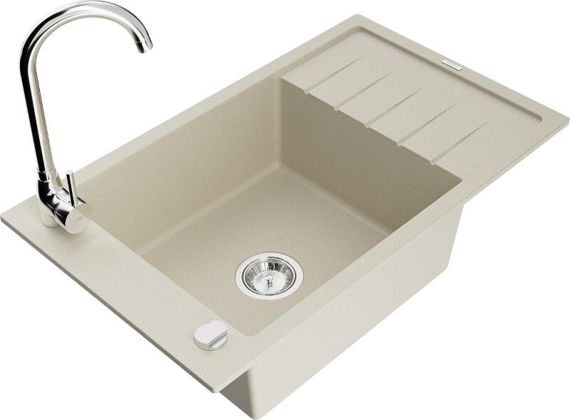 Mexen Elias, 1 kamrás gránit mosogató lefolyóval 795x480x200 mm Telma króm konyhai csapteleppel, bézs, 6511-69-670200-00 Elias konyhai mosogató: Termékkód: 6511791005-69 Szín: bézs Mérete: 795x480x200 mm Kamra mélysége: 190 mm Kamra méretei: 465x420 mm Lefolyó átmérője: ø90 mm Típus: 1 kamrás, rövid csepegtetővel Típus: a pultba süllyesztve Anyaga: gránit (80% gránit ad