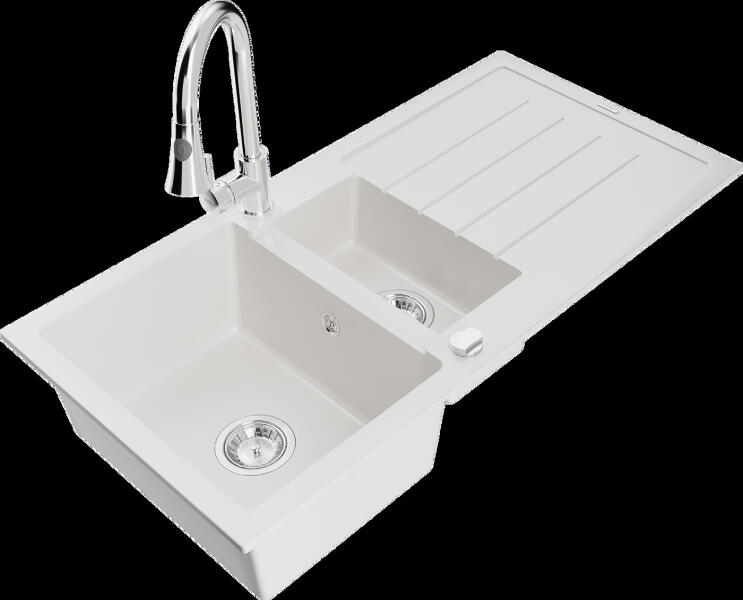 Mosogató: Gyártó: Mexen Sorozat: Andres Méretek: 1000x500x200 mm Kamra mélysége: 190 mm (nagyobb), 115 mm (kisebb) Kamra méretei: 430x330 mm (nagyobb), 340x170 mm (kisebb) Lefolyó átmérője: ø90 mm Típus: 1,5 kamrás csepegtetővel Típus: felülről az asztallapba való beágyazáshoz Anyaga: gránit (80% gránit adalékanyag + 20% gyanta) Túlfolyó nyílás: Igen Gyárilag előkész