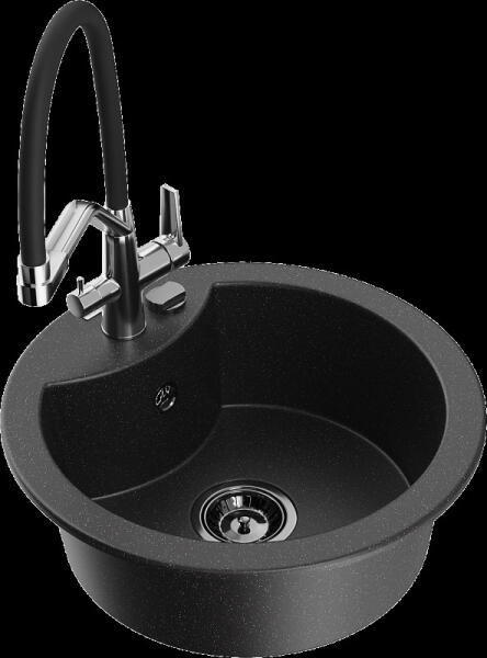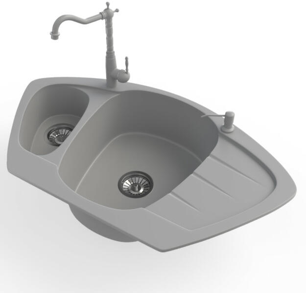 NERO Compact sarok gránit mosogató, ami egyben praktikus és impozáns látványelem is a konyhában. Tökéletes választás azokba a konyhákba, ahol a mosogató rész a sarokban lett kialakítva. Íves, de modern formatervezése nagyszerűen illik bármilyen stílusú konyhába. A mosogatón 2 lyuk lett kialakítva, egy a csaptelepnek és egy a beépíthető mosogatószer adagolónak vagy aut