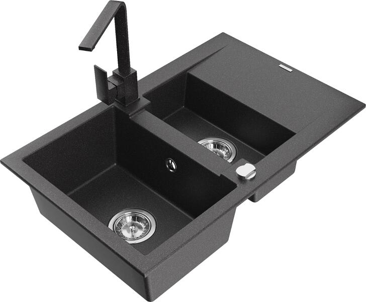 NERO Verso gránit mosogatótálca szemcsés fekete színben csapteleppel és automata dugókiemelővel. Kétmedencés, szimmetrikus elrendezésű mosogató, kellően nagyméretű medencékkel, a 75 cm-es szélesség egyszerre tágas és helytakarékos is. Letisztult formatervezés, kiemelkedő anyagvastagság jellemzi, ezáltal rendkívül masszív és ellenálló konstrukció. Anyaga 80% gránit