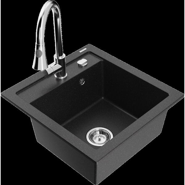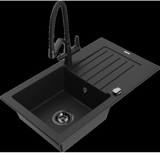 Mexen Elias, gránit mosogató gránit 795x480x200 mm, 1 kamrás, fekete foltos fekete szifonnal és fekete Rita mosogató csapteleppel, 6511-76-670300-70-B Gyártó: Mexen Sorozat: Elias Modell: 1 kamrás, rövid leeresztővel Felszerelés: munkalapra Szín: fekete foltos Felületkezelés: sima Hossza 795 mm Szélesség 480 mm Magasság: 200 mm Kamra mélysége: 190 mm Kamra mérete: 465x420 mm