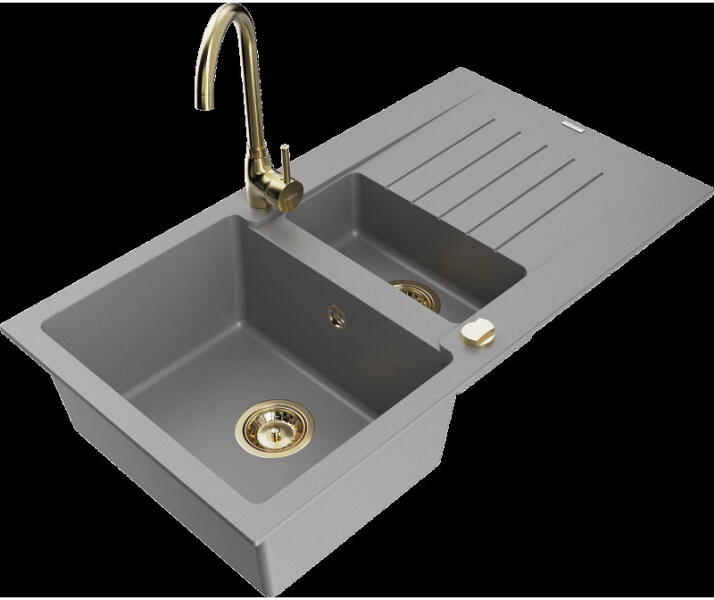 Mexen Mario, 2 kamrás gránit mosogató 82x44 cm konyhai csapteleppel Telma, szürke, 6504-71-670200-71 Mosogató: Termékkód: 6504822000-20 Mérete: 820x436x161 mm Kamra mélysége: 151 mm Kamra méretei: 356x336 mm Lefolyó átmérője: ø90 mm Típus: 2 kamrás Típus: Az asztallapba süllyesztett Szín: Szürke Anyaga: gránit (80% gránit adalékanyag 20% gyanta) Túlfolyó nyílás: Igen L
